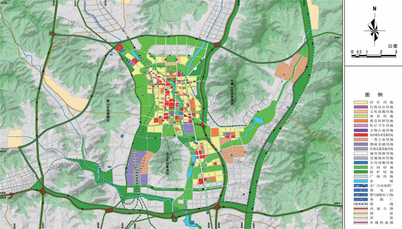 規(guī)劃采取非均衡發(fā)展策略,構(gòu)建圍繞中心城市的“手掌”狀半小時(shí)經(jīng)濟(jì)圈,中心城區(qū)為“掌心”,交通軸線為“手指”,沿線城鎮(zhèn)和產(chǎn)業(yè)園區(qū)為“關(guān)節(jié)”,打造 1+5 城鎮(zhèn)與產(chǎn)業(yè)集聚區(qū),提高城市核心競(jìng)爭(zhēng)力,提升區(qū)域協(xié)作水平,確定了“一城三區(qū)”組團(tuán)空間結(jié)構(gòu),將城市西南片區(qū)及米山片區(qū)納入城市建設(shè)用地范圍,提出了“擁山不占山,營水親近水”的生態(tài)綠地建設(shè)原則,構(gòu)建了“五山相擁、四河相匯”的生態(tài)綠地系統(tǒng),將周邊山體引入城市,將城市河流與大自然相連。